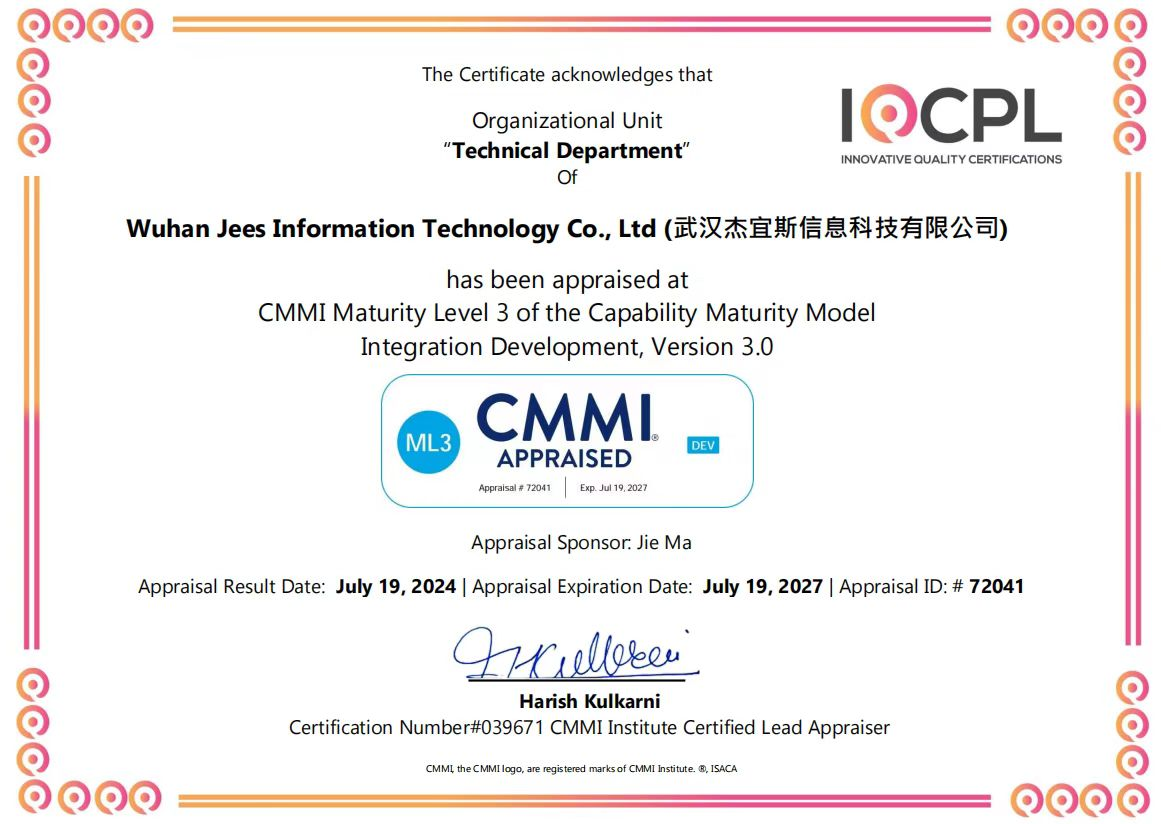 傑宜斯科(kē)技(jì)持 Ω有(yǒu)30餘項計(jì)算(suàn∑₩¥)機(jī)軟件(jiàn)著作(zuò)權及4₽β∑ 0餘項注冊商标,是(shì)湖(hú)北(běi)省>£“高(gāo)新技(jì)術(shù)企業(yè)”,榮獲湖≠₩®Ω(hú)北(běi)省第十七屆、武漢市(shì)2022-202¥ 3年(nián)度“守合同重信用(yòng)企業(yè)”稱号。此外(α®φwài),公司還(hái)通(tōng)過了(le)ISO9001質量管理(♠ lǐ)體(tǐ)系、ISO27001信息✘✘☆安全管理(lǐ)體(tǐ)系、ISO20000服務管理(lǐ)體(tǐ)系及€×‌CMMI三級(能(néng)力成熟度模型集成)等多(duō)←♣π∏項國(guó)際權威認證。這(zhè)些(xiē)成果充分(fēn)彰↑™&×顯了(le)傑宜斯科(kē)技(jì)以科(kē)技(j¶∏ì)創新與規範化(huà)運營為(wèi)核心競争力,在科(kē)技$✔(jì)創新、産品研發、質量管控、信息安全、服務管理(lǐ)及軟₽☆件(jiàn)開(kāi)發全流程管理(↑♥∞÷lǐ)等領域的(de)專業(yè)實力,以及在軟件(jiàn)産業(y δπè)中的(de)國(guó)際認可(kě)度。